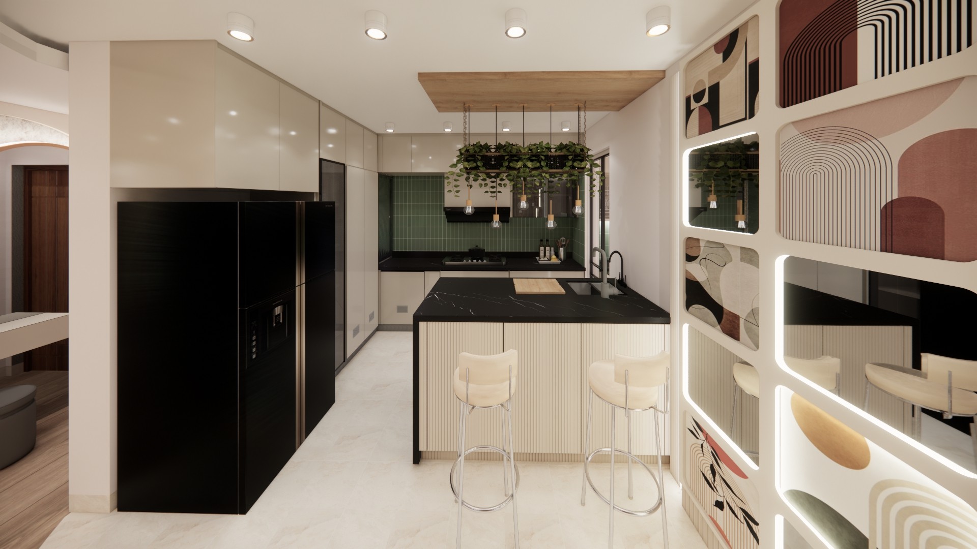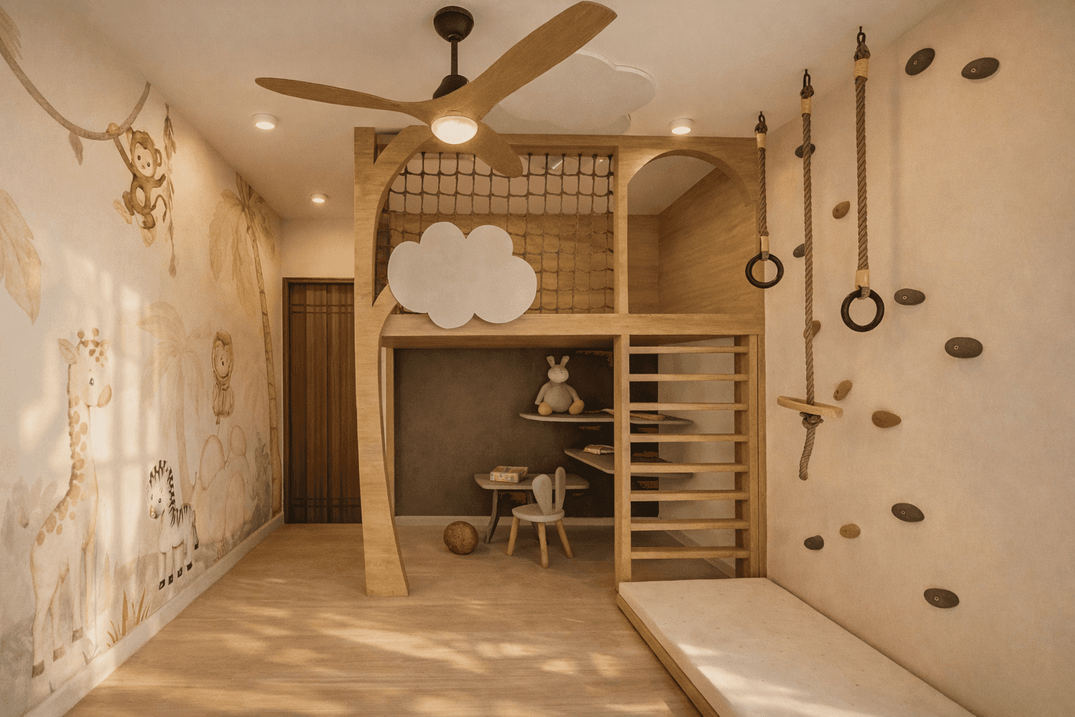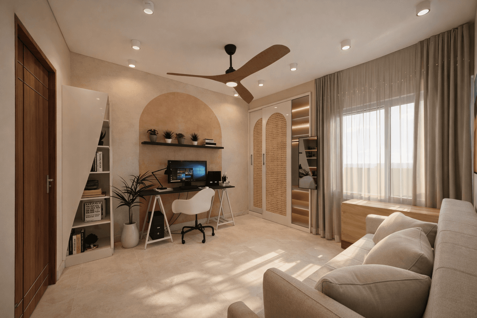 The space blends warm materials, soft arches, and biophilic elements